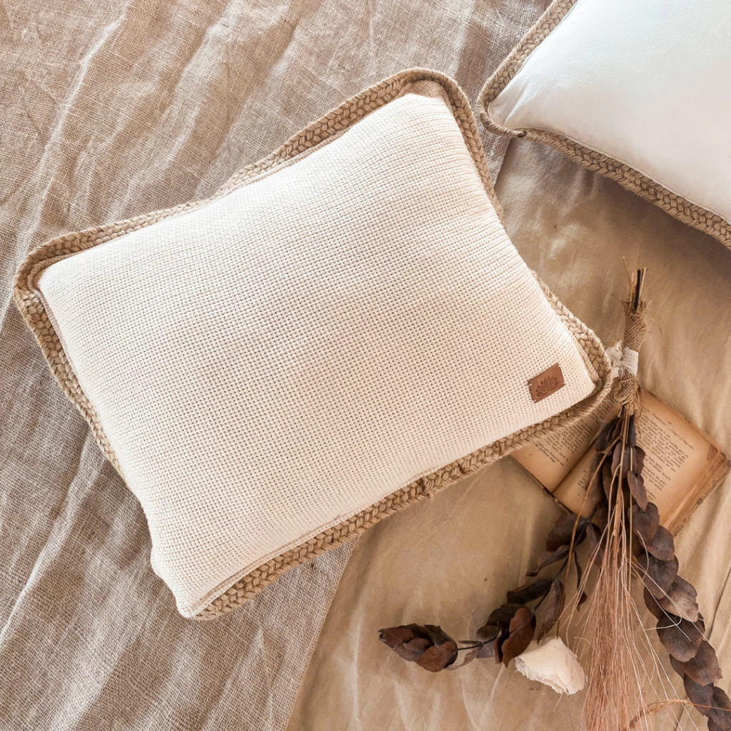 Almohadones originales realizados en tela telar y cinta de yute de India con tusor, que se pueden desarmar.