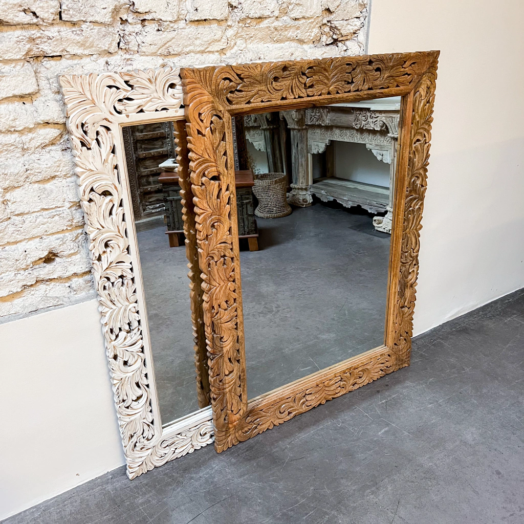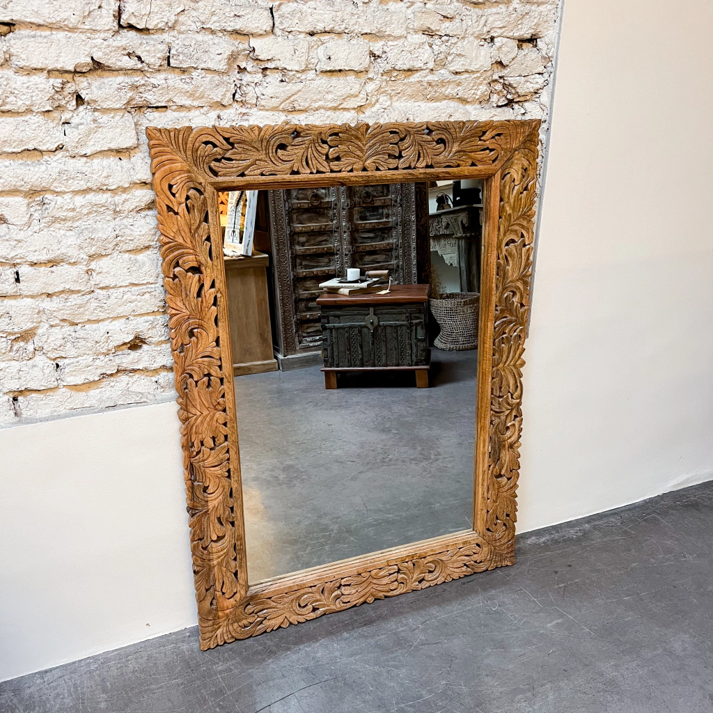 Exquisitamente trabajado en madera de teca, este marco mediano presenta detalles florales tallados a mano que elevan la decoración de cualquier pared.