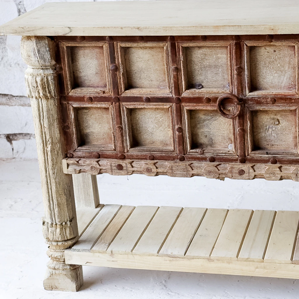 Las consolas Benares están hechas en madera maciza de teca aclarada, con un estante inferior que aporta funcionalidad sin perder elegancia. Cada unidad presenta un frente único, con tallas artesanales y detalles en metal con pátina óxido, que las convierte en piezas con carácter propio y espíritu decorativo.