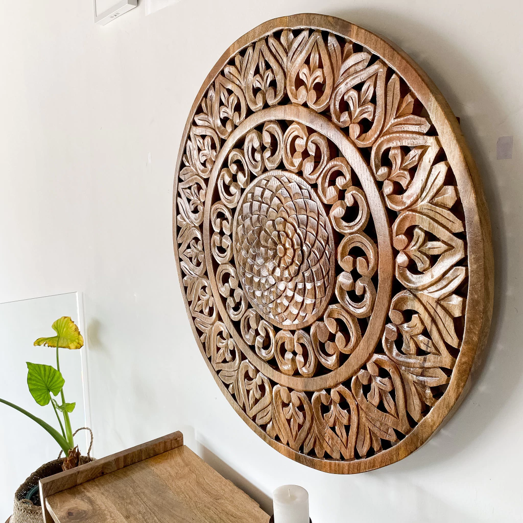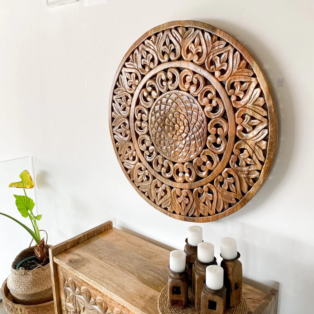 Transformá tus espacios con la belleza atemporal de nuestro panel circular tallado a mano, que añade un toque de distinción a cualquier espacio.